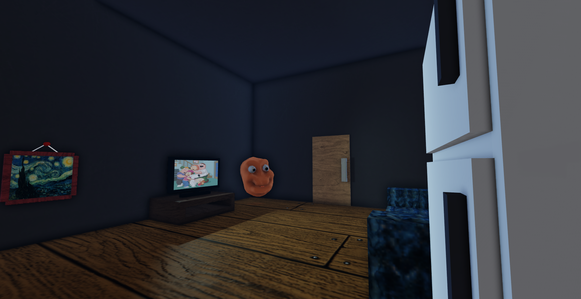 The Void is a medium-sized black room that has two monitors in the top-right corner with Efeuc laying down next to them, and a sign simply saying "back", which being clicked or tapped on, will take you back to the front of the second floor on the The Bus.